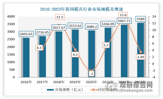 近年在工业市场发展繁茂以及下游应用市场需求增长下,我国模具行业发展快速,市场规模不断增长。数据显示,2022 年我国模具行业市场规模约为 3467.73 亿元,同比增长 12.6%。到2023年我国模具行业市场规模达到3589 亿元,同比增长3.49%左右。