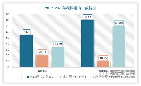 伴随着我国制造业的不断发展,国内模具行业的规模及综合竞争力进步明显。从进进出口来看,2017-2023年我国出口规模逐年递增,进口规模呈下降趋势,净出口额呈现较为显著的增长趋势。数据显示,207-2023年我国进口额从20.51亿美元下降到10.25 亿美元;出口额从54.90 亿美元增长到80.13 亿美元;净出口额从34.39亿美元增长到69.88亿美元。