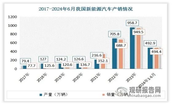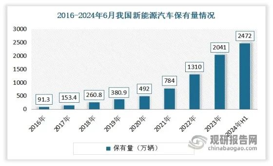 新能源汽车方面:经过多年发展,我国新能源汽车产业已进入市场化高速发展阶段,产销规模已连续九年位居世界首位。公安部的统计数据显示,截至2024年6月底,我国新能源汽车保有量达2472万辆,占汽车总量的7.18%;产销分别完成492.9万辆和494.4万辆,同比分别增长30.1%和32%,市场占有率也已高达35.2%。