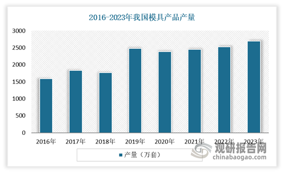 经过多年的发展,目前我国已成世界模具制造和贸易大国,产量不断增长。2022年我国模具产品的产量为2631.17万套,同比增长7.4%。2023年,我国模具行业产量约为2695.88万套,同比增长7.4%。